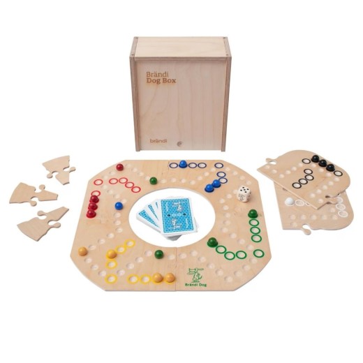 Le Brandi Dog est un jeu de société stratégique et collaboratif qui se joue en équipes de deux. Chaque joueur doit amener ses quatre pions jusqu’à sa maison en utilisant des cartes pour avancer, reculer ou échanger des positions sur le plateau.